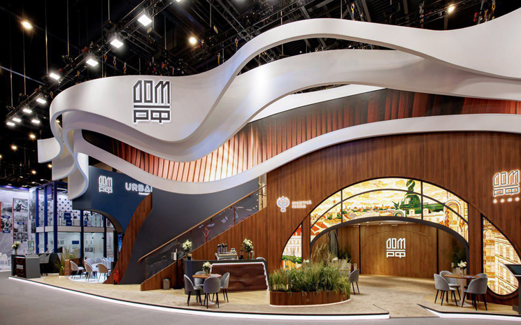 Выставочный стенд, оформленный в компании Grata Adv. Материал для декорирования стен под дерево печатался на пятиметровом принтере