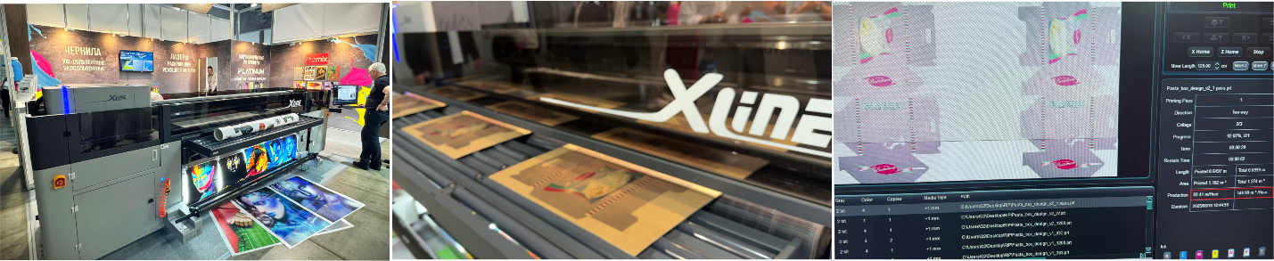 был продемонстрирован в различных режимах и на различных материалах – классической ПВХ и полипропиленовой рулонных пленках, ПВХ и картоне, со скоростью печати до 149м2/час (см фото)!