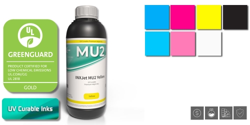 Чернила INXJet MU2 изготавливаются только из возобновляемых природных ресурсов и не содержат циклогексанон. Размер частиц пигмента в них не превышает 1 микрона, что способствует уменьшению частоты обслуживания печатающих головок. Устойчивость напечатанных с их помощью изображений к выцветанию составляет до 2 лет.